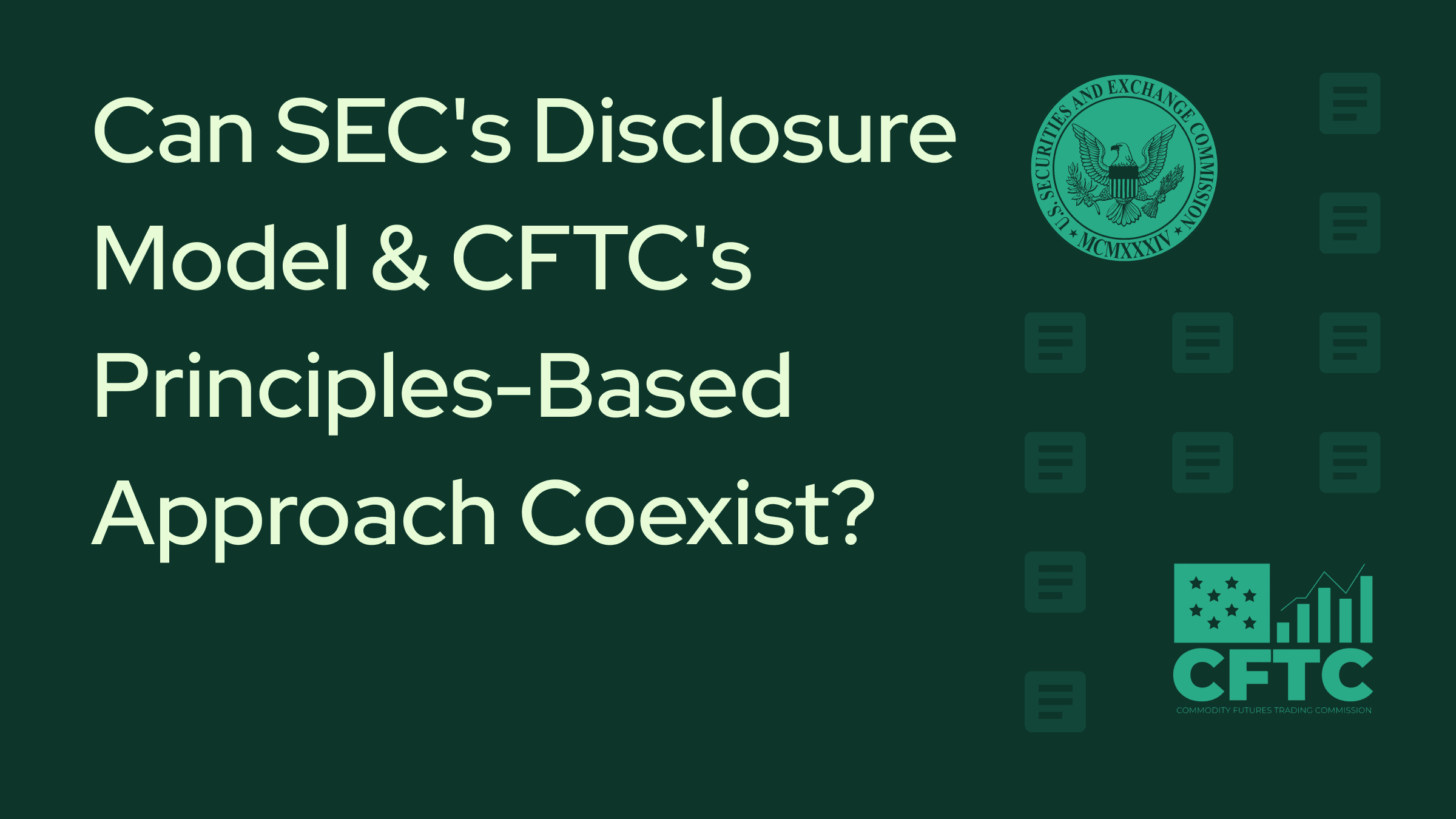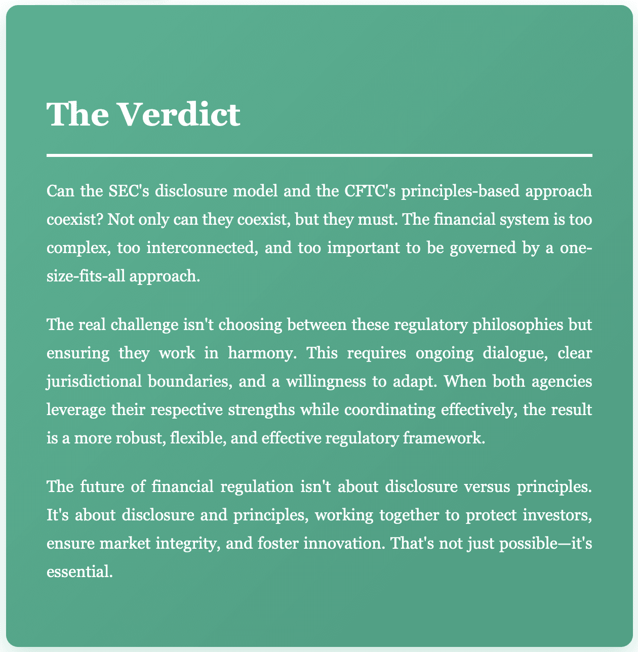There's a compelling argument that we need both approaches more than ever. The SEC's disclosure model provides essential transparency for an increasingly complex financial system. The CFTC's principles-based framework offers the flexibility needed to regulate rapid innovation without crushing it.