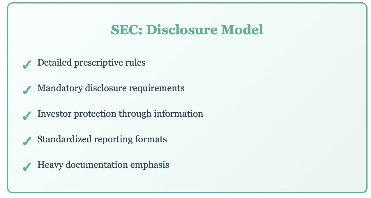 The SEC operates on a simple yet powerful premise: sunlight is the best disinfectant. Born from the ashes of the 1929 stock market crash, the SEC believes that informed investors make better decisions. Their approach is exhaustive and exhausting in equal measure. Companies must disclose everything from executive compensation to risk factors, from related-party transactions to material events.