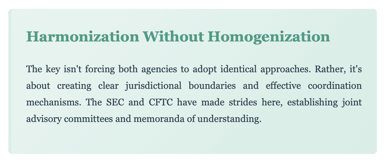 Consider the approach to swap regulation under Dodd-Frank. Rather than fighting over territory, the agencies divided responsibilities: security-based swaps to the SEC, other swaps to the CFTC. It's not perfect, but it demonstrates that coexistence is possible with clear rules of engagement.