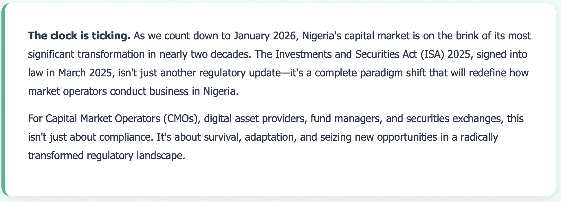 The countdown to 2026 represents more than just a deadline—it's a countdown to a new era for Nigeria's capital markets. The ISA 2025 is ambitious, comprehensive, and necessary. It reflects a market that's grown up, learned from past failures, and is ready to compete globally.