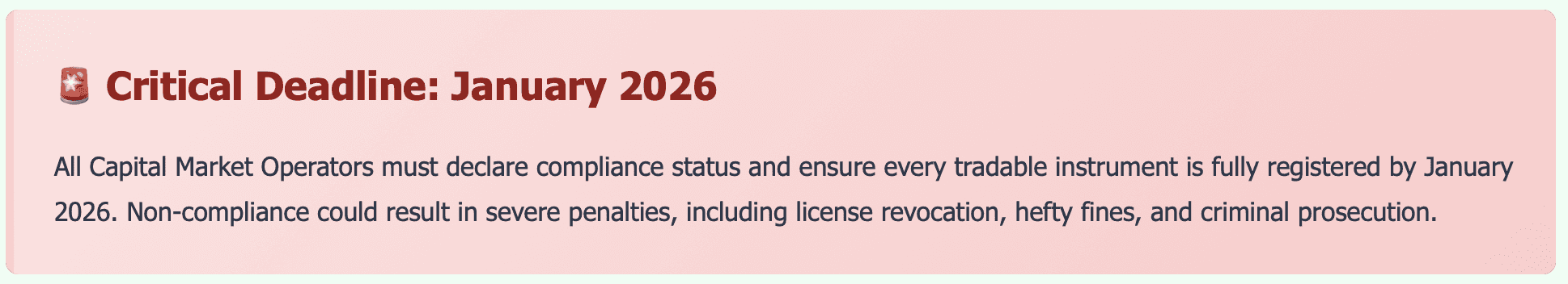 Register All Tradable InstrumentsEnsure every instrument under your management is fully registered with the SEC. This is non-negotiable and must be completed by the January 2026 deadline.