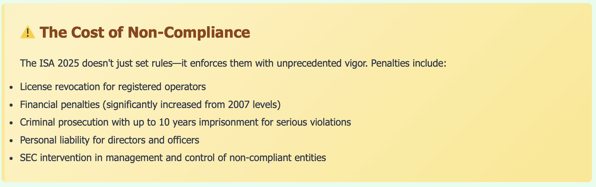 Conduct Immediate Compliance AuditReview all your operations against ISA 2025 requirements. Identify gaps in registration, licensing, reporting, and operational procedures.