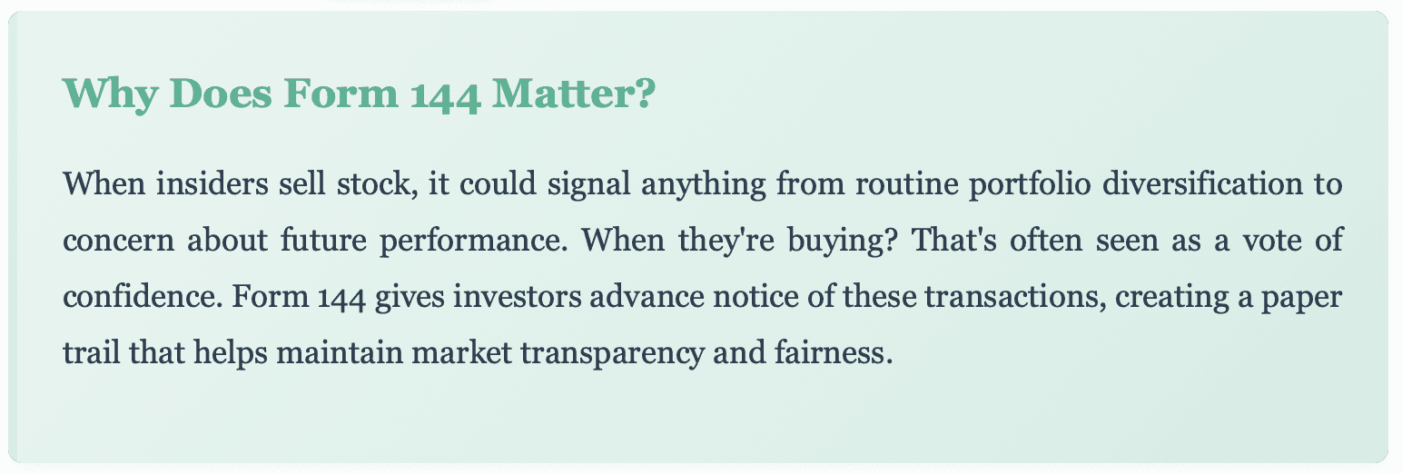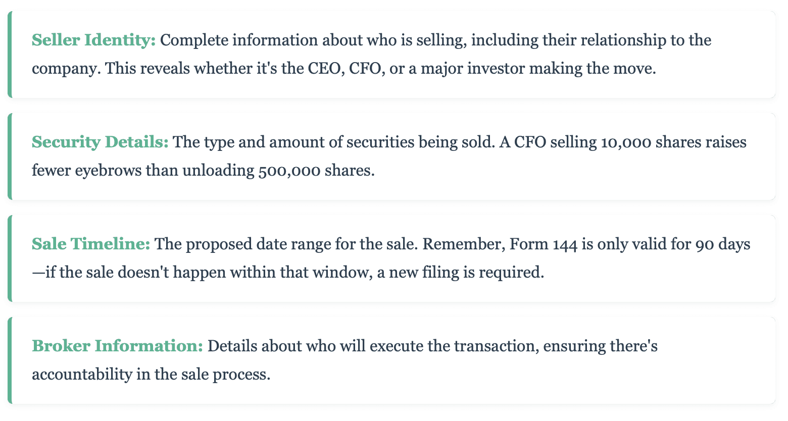 Form 144 might seem like just another regulatory document, but each section tells part of a larger story. Here's what insiders must disclose: