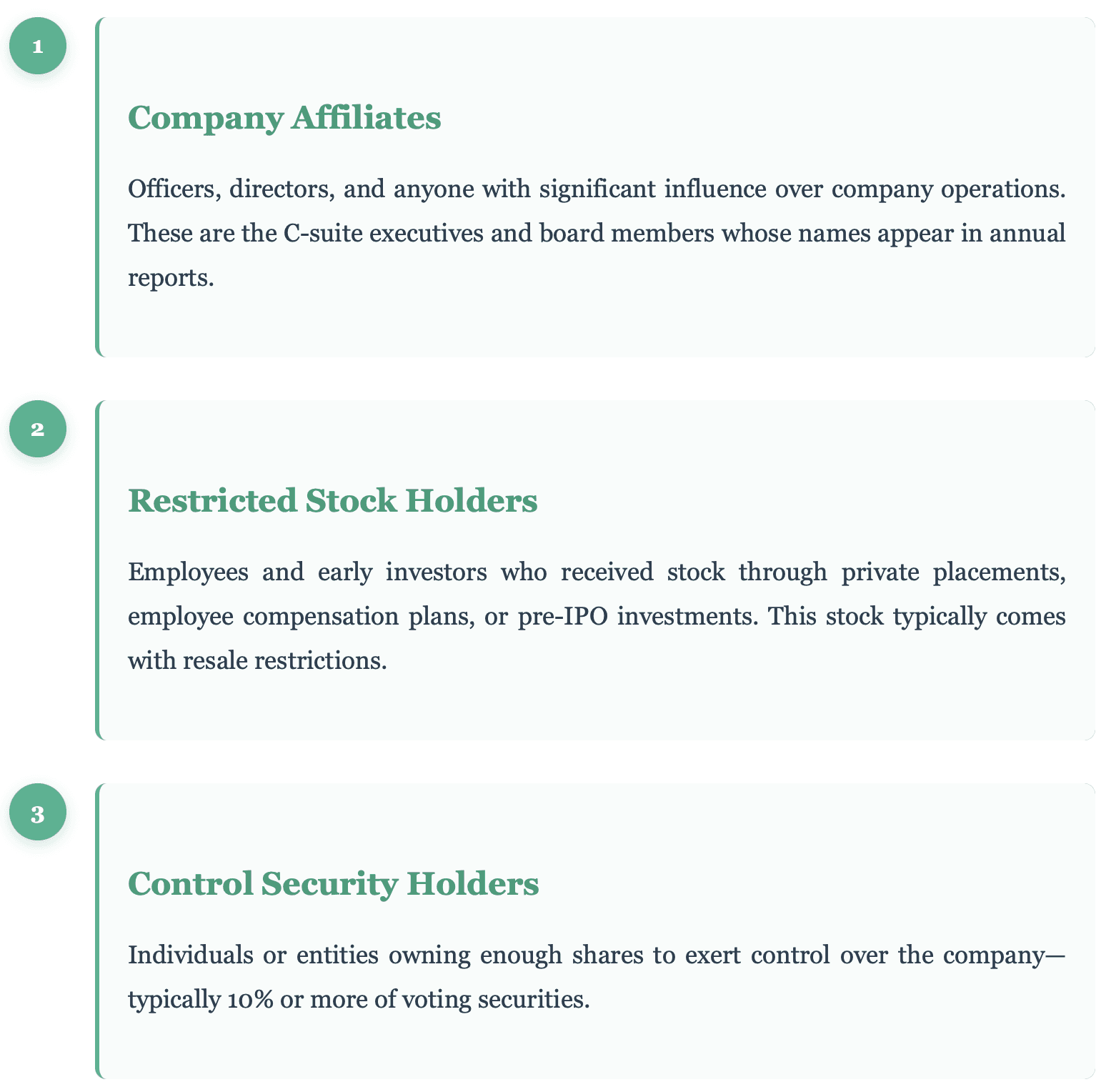 Holding period matters: For restricted securities, sellers typically must hold them for at least six months (for reporting companies) or one year (for non-reporting companies) before selling.