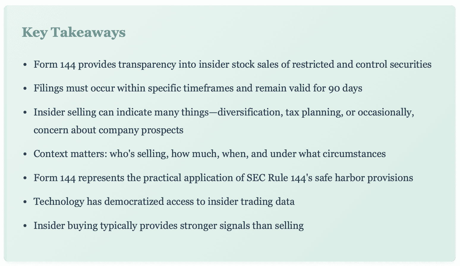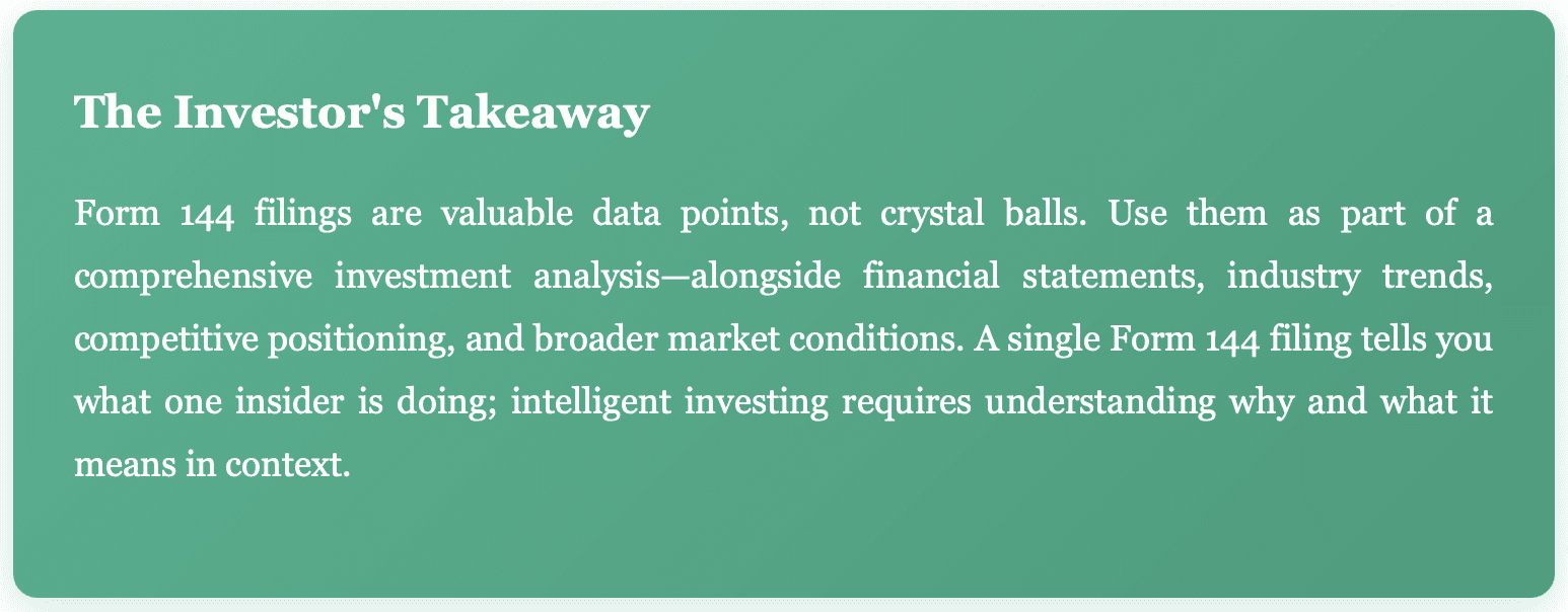Form 144 filings don't just represent legal compliance—they're market signals that sophisticated investors monitor closely. But interpreting these signals requires nuance.