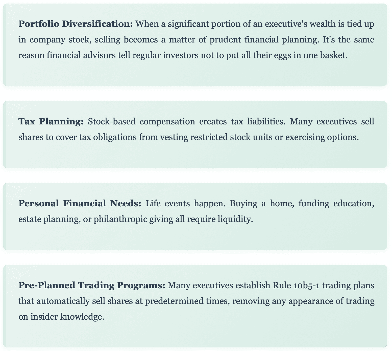The million-dollar question (sometimes literally): Why do insiders sell their stock? The motivations are far more complex and often more benign than market cynics might suggest.