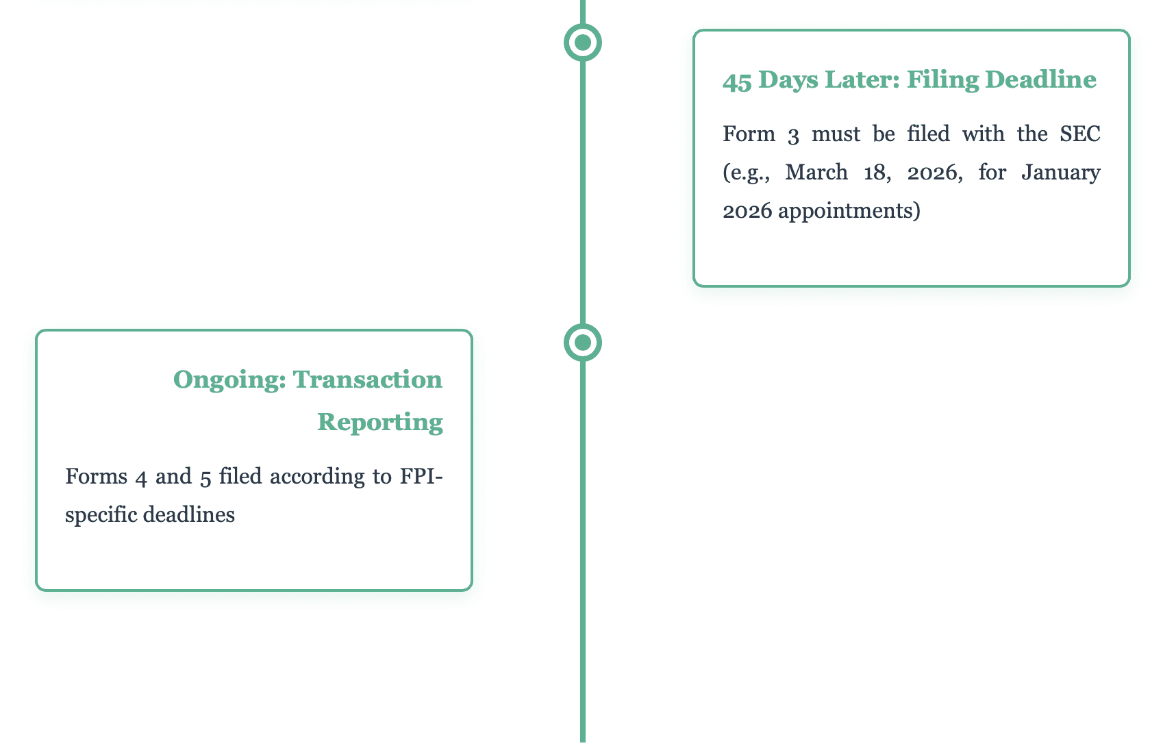 After filing Form 3, directors must maintain ongoing compliance through Forms 4 and 5. Form 4 reports changes in beneficial ownership and must be filed within two business days of most transactions. Form 5, due within 45 days after fiscal year-end for FPIs, captures certain exempt transactions and holdings.