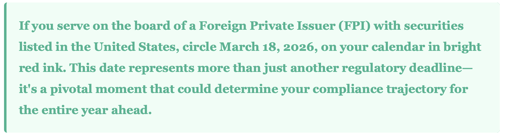 March 18, 2026: The Section 16 Deadline Every Foreign Private Issuer (FPI) Director Must Know.