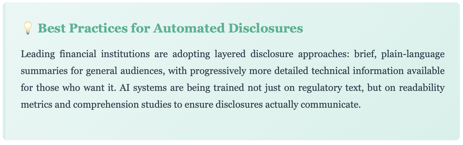 The challenge is ensuring these disclosures don't simply check compliance boxes but actually inform consumers meaningfully. An AI that generates technically accurate but incomprehensible disclosures serves neither the institution's nor the consumer's interests.