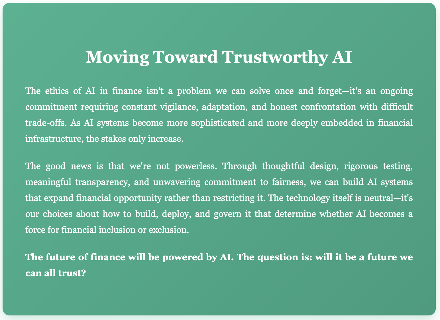 **Financial Institutions **must invest in ethical AI infrastructure, conduct regular bias audits, and foster cultures that prioritize fairness alongside profitability. This means sometimes accepting slightly lower short-term performance for better long-term outcomes and reduced risk.