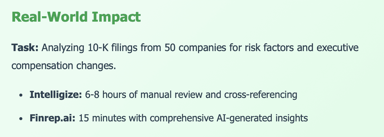 The Bottom Line: While Intelligize served the market well in its time, Finrep.ai represents a fundamental leap forward in how financial professionals access, analyze, and act on critical information. This isn't just an upgrade—it's a revolution.