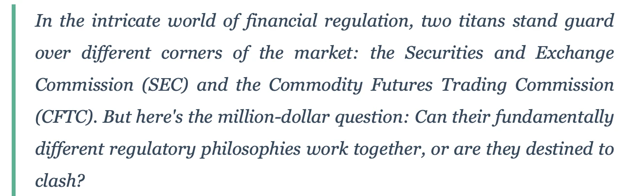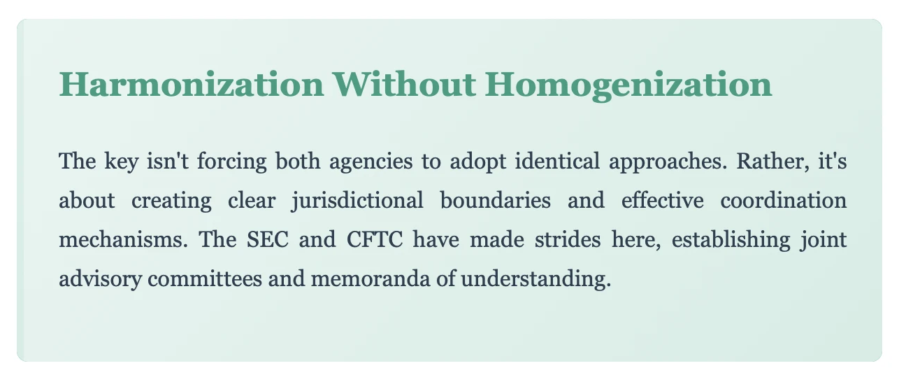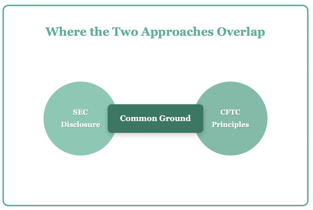 Flexibility Meets Structure: The SEC's prescriptive approach creates a baseline of transparency that everyone understands. The CFTC's flexibility allows for innovation and adaptation. Together, they create a regulatory framework that's both stable and dynamic.