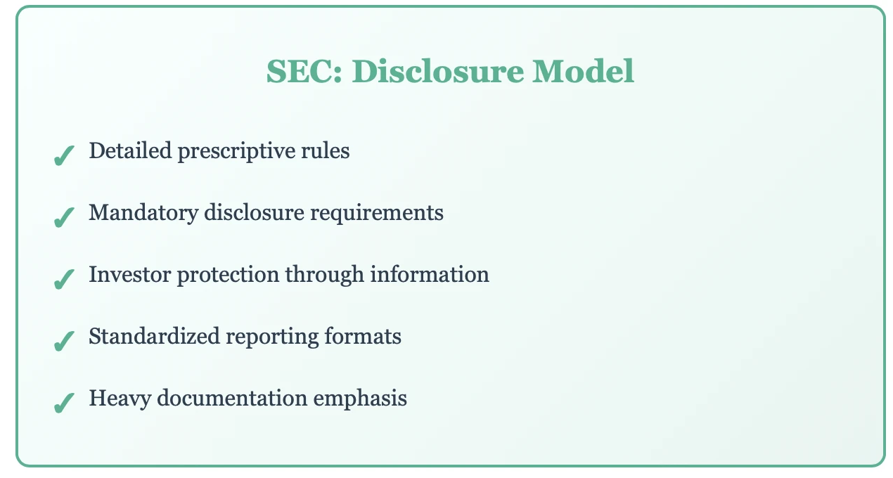 The SEC's disclosure-based model and the CFTC's principles-based framework are complementary rather than contradictory. They serve different market segments with different needs: the SEC protects retail investors through mandatory transparency, while the CFTC provides sophisticated institutional participants with the flexibility to innovate. Each agency has also adopted elements of the other's approach over time, creating cross-regulatory learning.