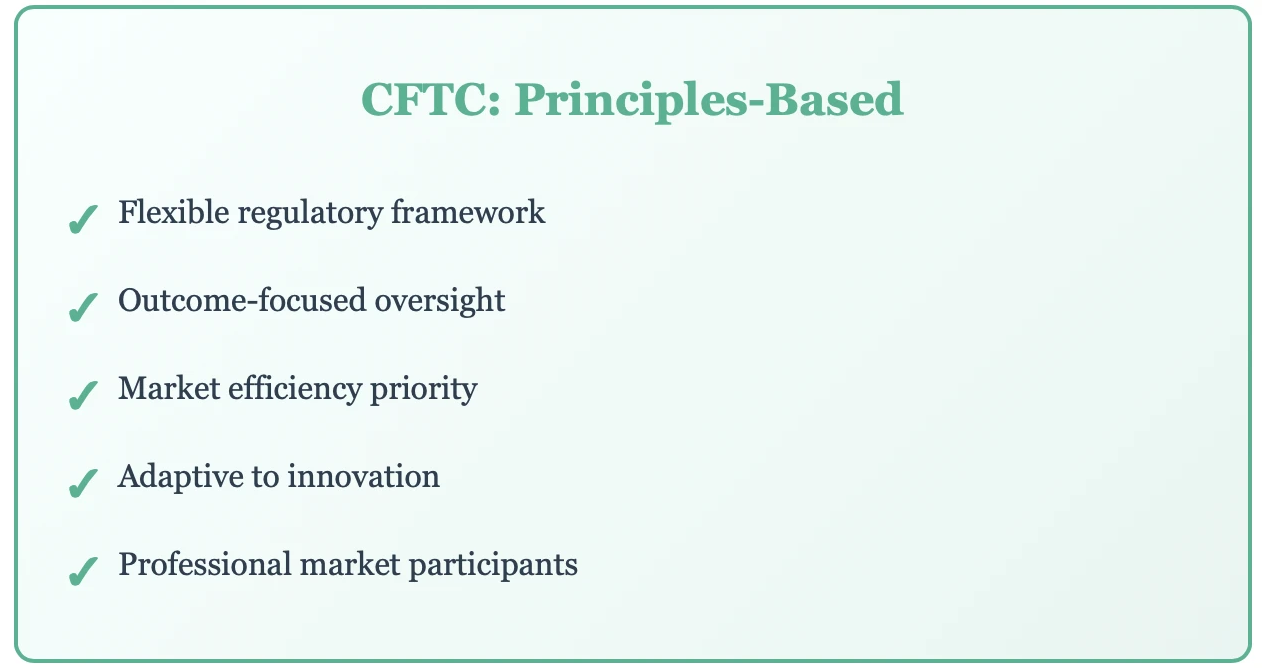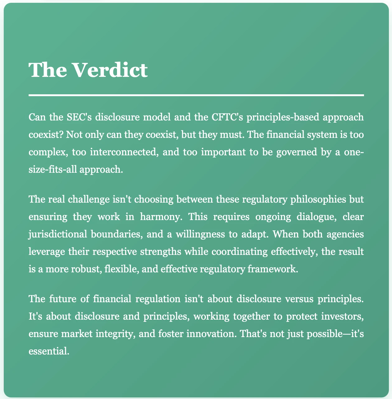There's a compelling argument that we need both approaches more than ever. The SEC's disclosure model provides essential transparency for an increasingly complex financial system. The CFTC's principles-based framework offers the flexibility needed to regulate rapid innovation without crushing it.