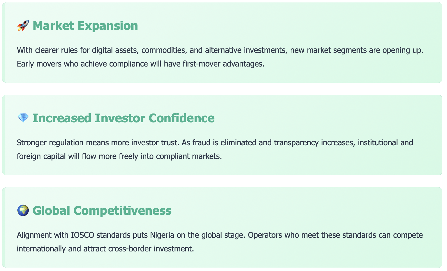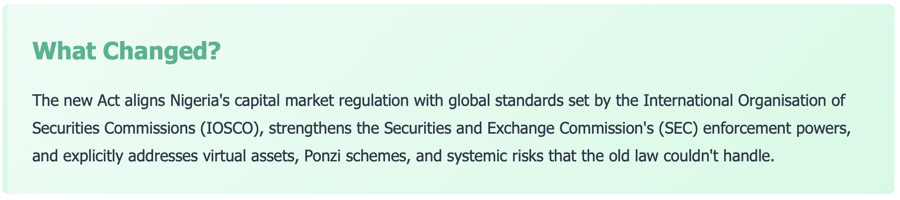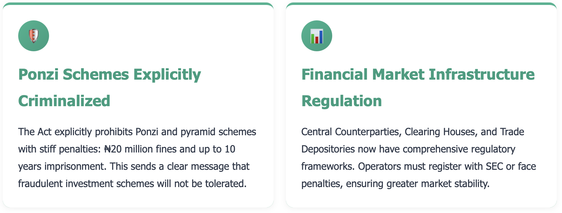 You now have a comprehensive regulatory framework. Registration with SEC is mandatory, and you'll face stiff penalties for non-compliance. This brings clarity and legitimacy to the commodities ecosystem in Nigeria.