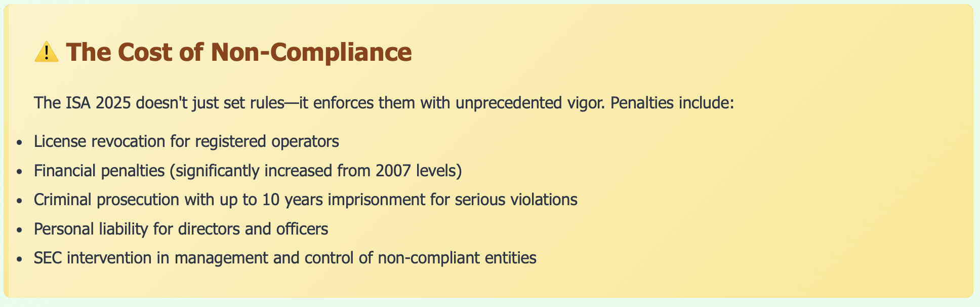 Review all your operations against ISA 2025 requirements. Identify gaps in registration, licensing, reporting, and operational procedures.