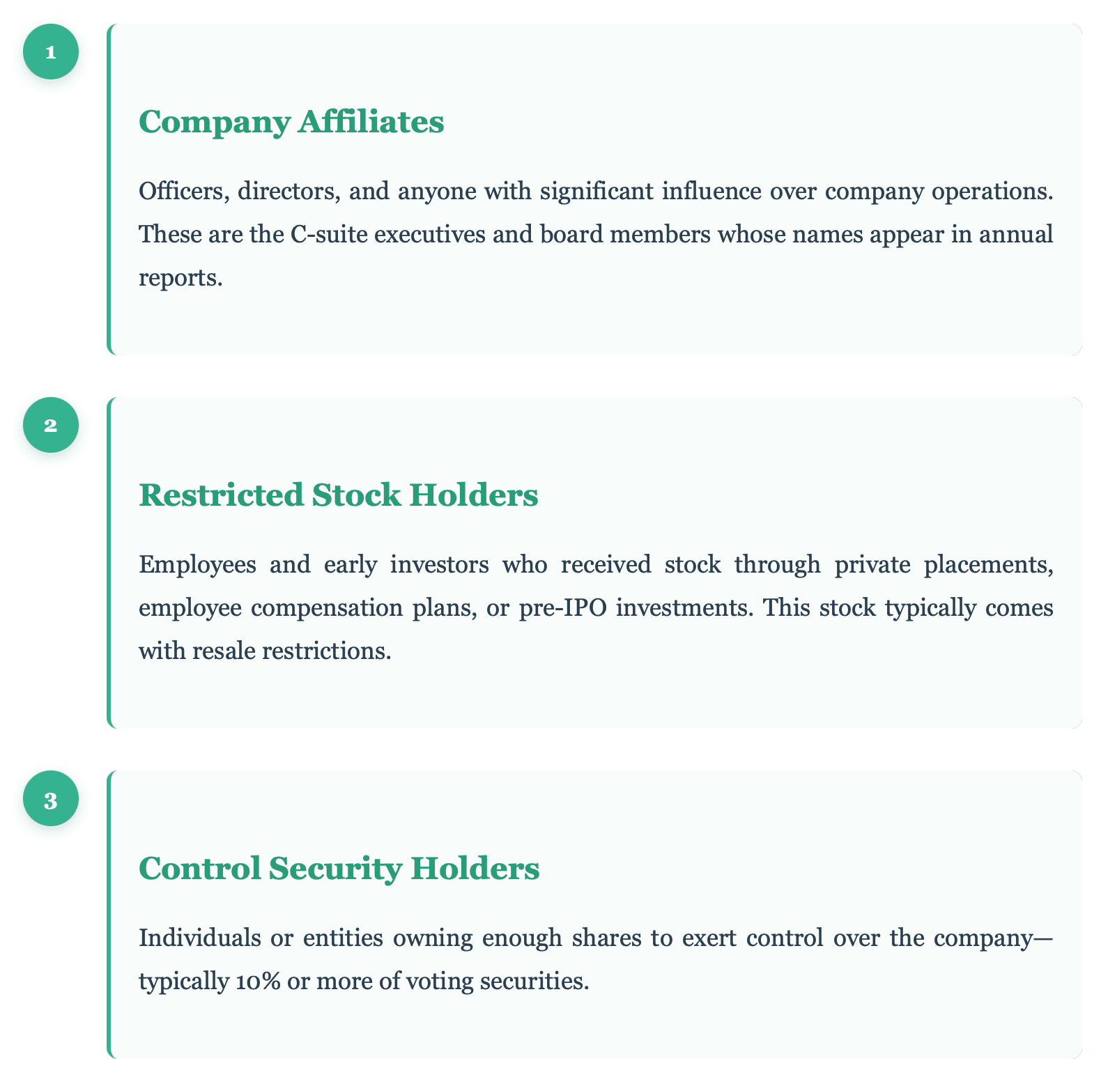 - Holding period matters: For restricted securities, sellers typically must hold them for at least six months (for reporting companies) or one year (for non-reporting companies) before selling.