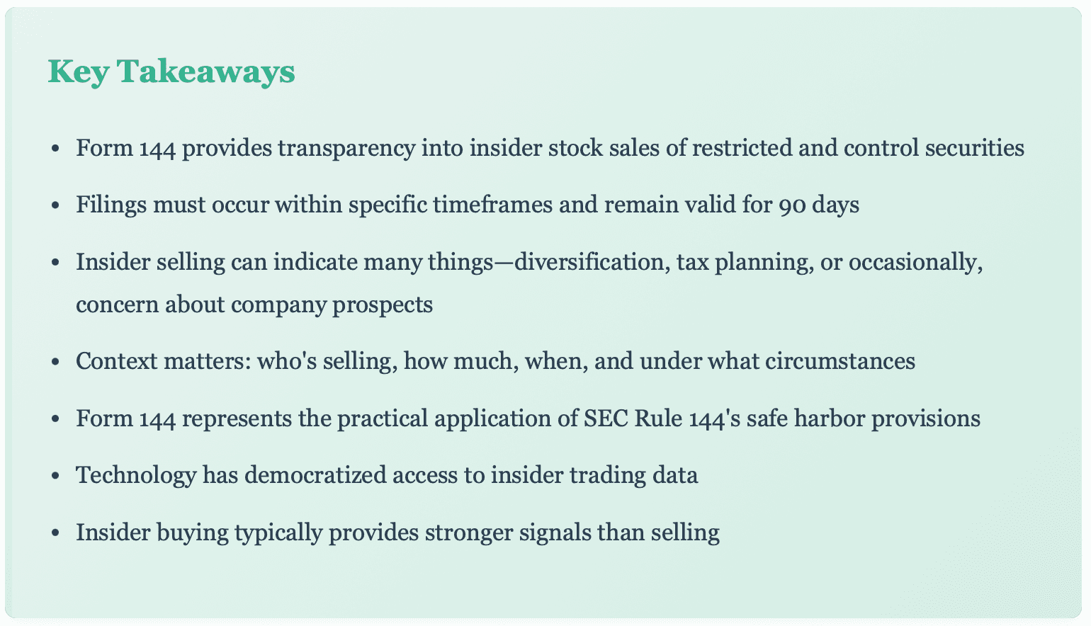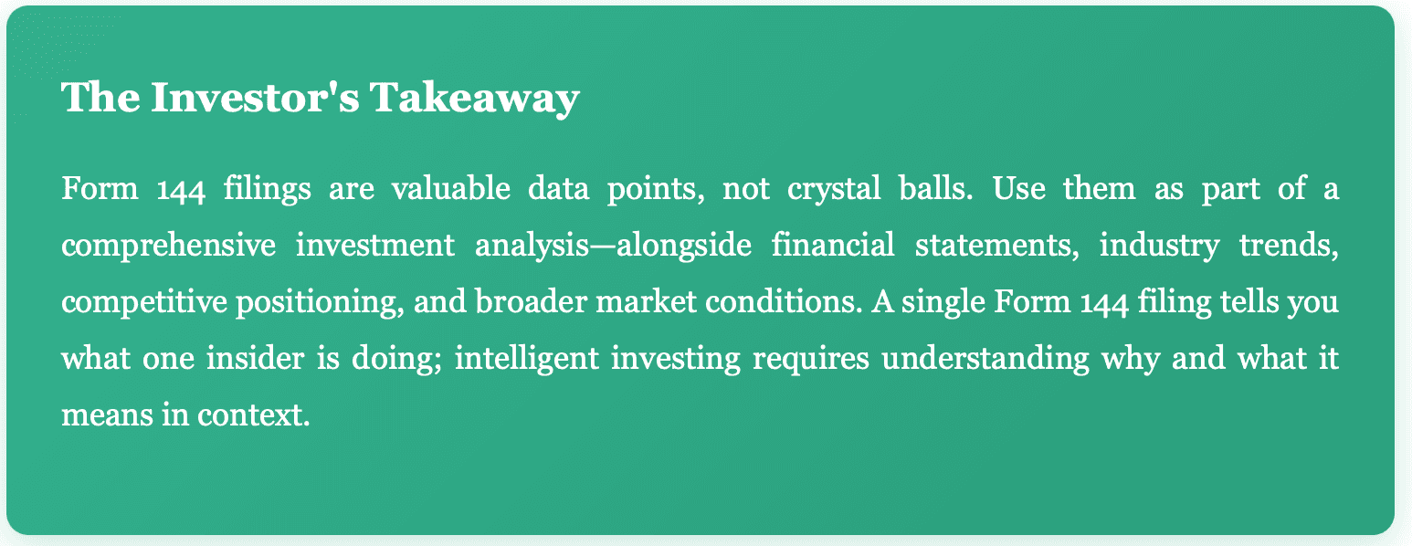 Form 144 filings don't just represent legal compliance—they're market signals that sophisticated investors monitor closely. But interpreting these signals requires nuance.