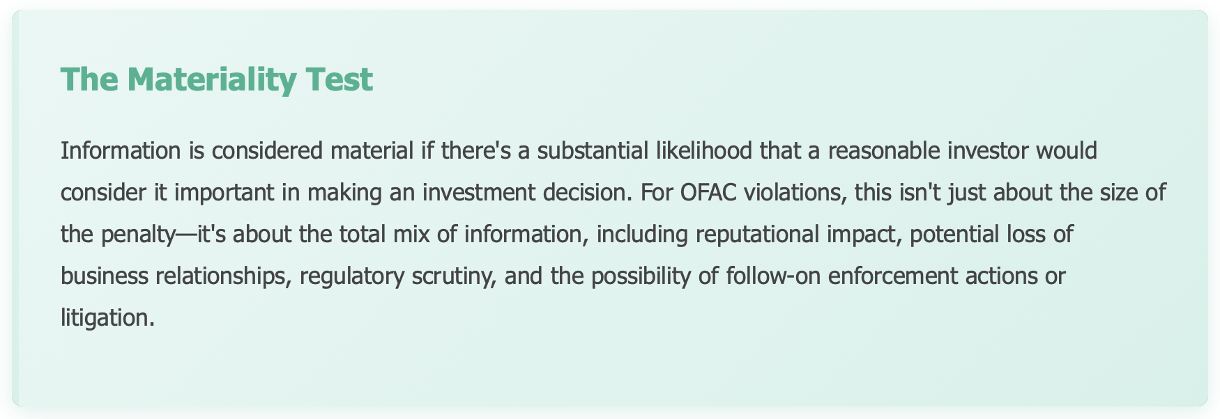 The Securities and Exchange Commission requires public companies to disclose "material" information that could affect an investor's decision-making, as established under SEC Regulation S-K and the Supreme Court's TSC Industries v. Northway standard. But what makes an OFAC violation "material"? The answer isn't always straightforward.