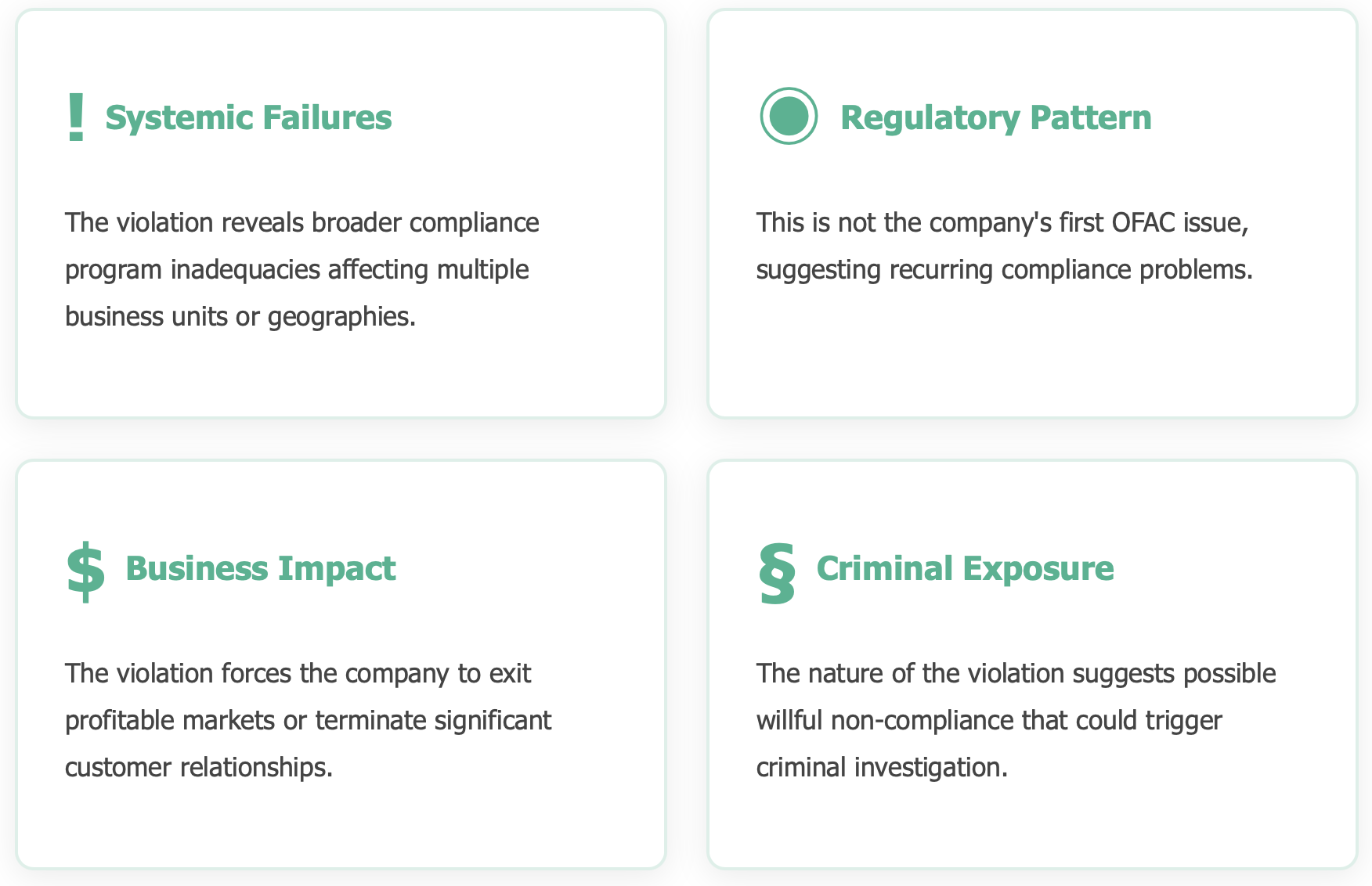 ✓ Operational Impact: Whether violations affect ongoing operations, future business plans, or strategic relationships. Any markets or customers being exited. Potential collateral consequences like banking relationship issues.
