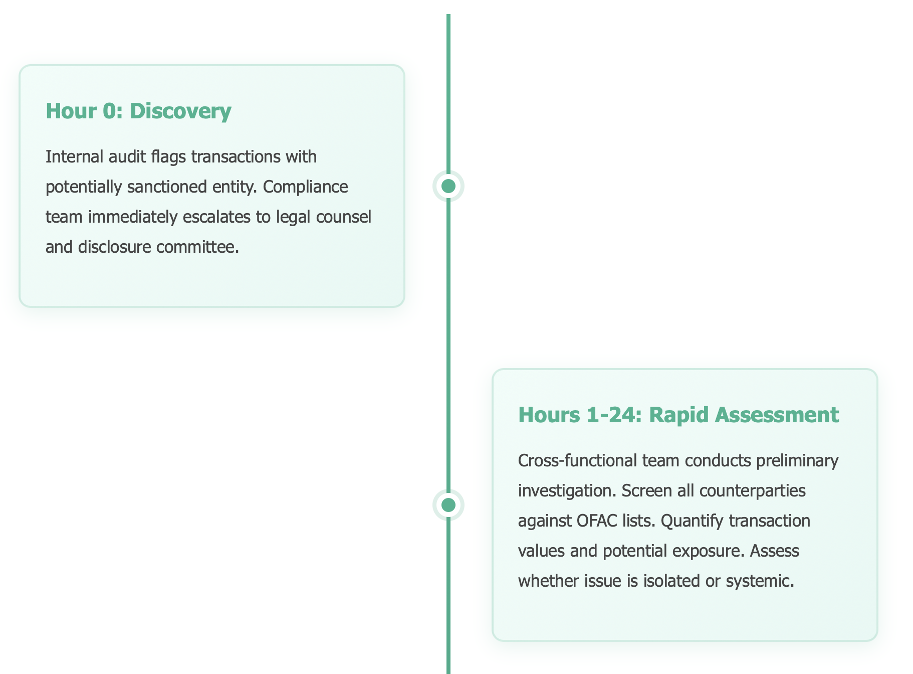 This requires having outside counsel on retainer who specialize in both sanctions and securities law, maintaining relationships with forensic accountants and investigators, and ensuring disclosure committee members can be mobilized on short notice—including after hours and on weekends.