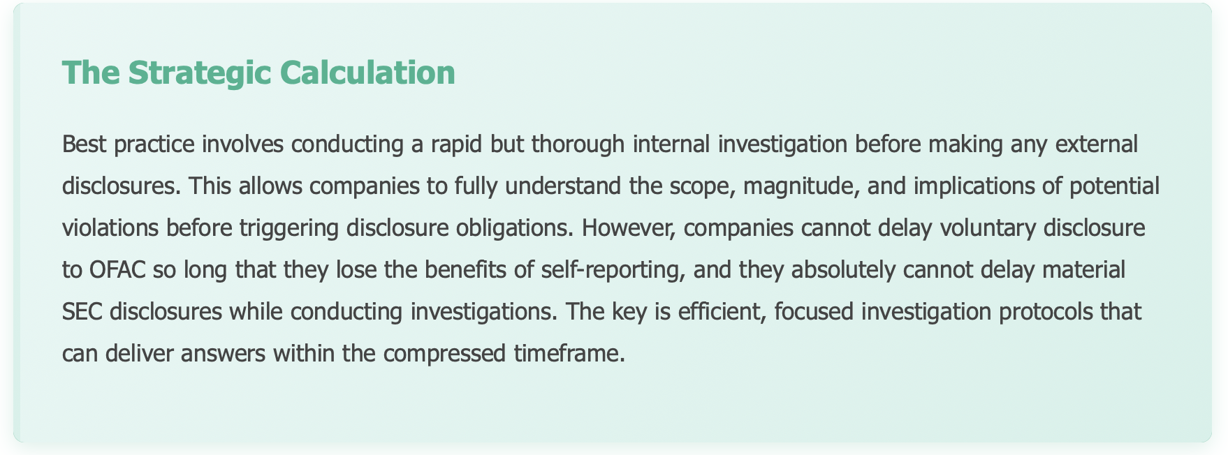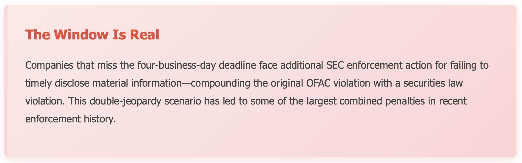 When a public company determines an OFAC violation is material, Form 8-K must be filed with the SEC within four business days. However, significant ambiguity exists around when the triggering "event" occurs — whether at discovery, completion of internal investigation, receipt of an OFAC inquiry, or proposal of penalties. This timeline uncertainty creates intense pressure for rapid internal assessment and disclosure decision-making.
