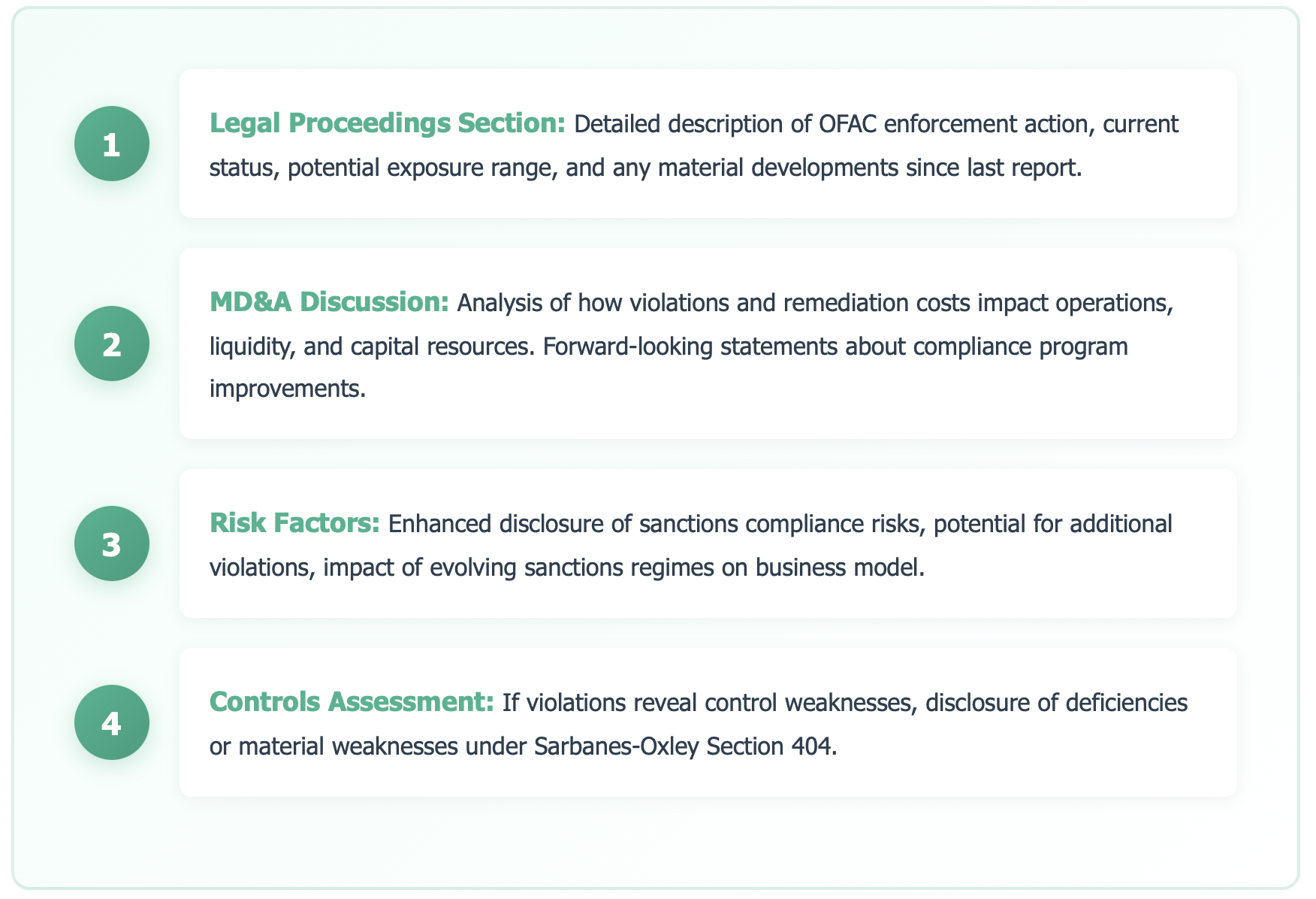OFAC violations create ongoing disclosure obligations that extend well beyond the initial 8-K filing, persisting through quarterly 10-Q and annual 10-K reports for years. Companies must provide updates on legal proceedings, revise risk factors, and address material uncertainties in the MD&A section. The ripple effect often includes material weakness disclosures, shareholder lawsuits, and sustained market capitalization declines.