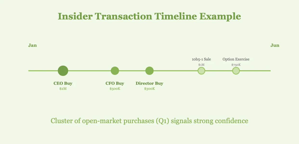 Patterns: Track whether multiple insiders are transacting in the same direction. Coordinated buying across executives, directors, and large shareholders is particularly meaningful.