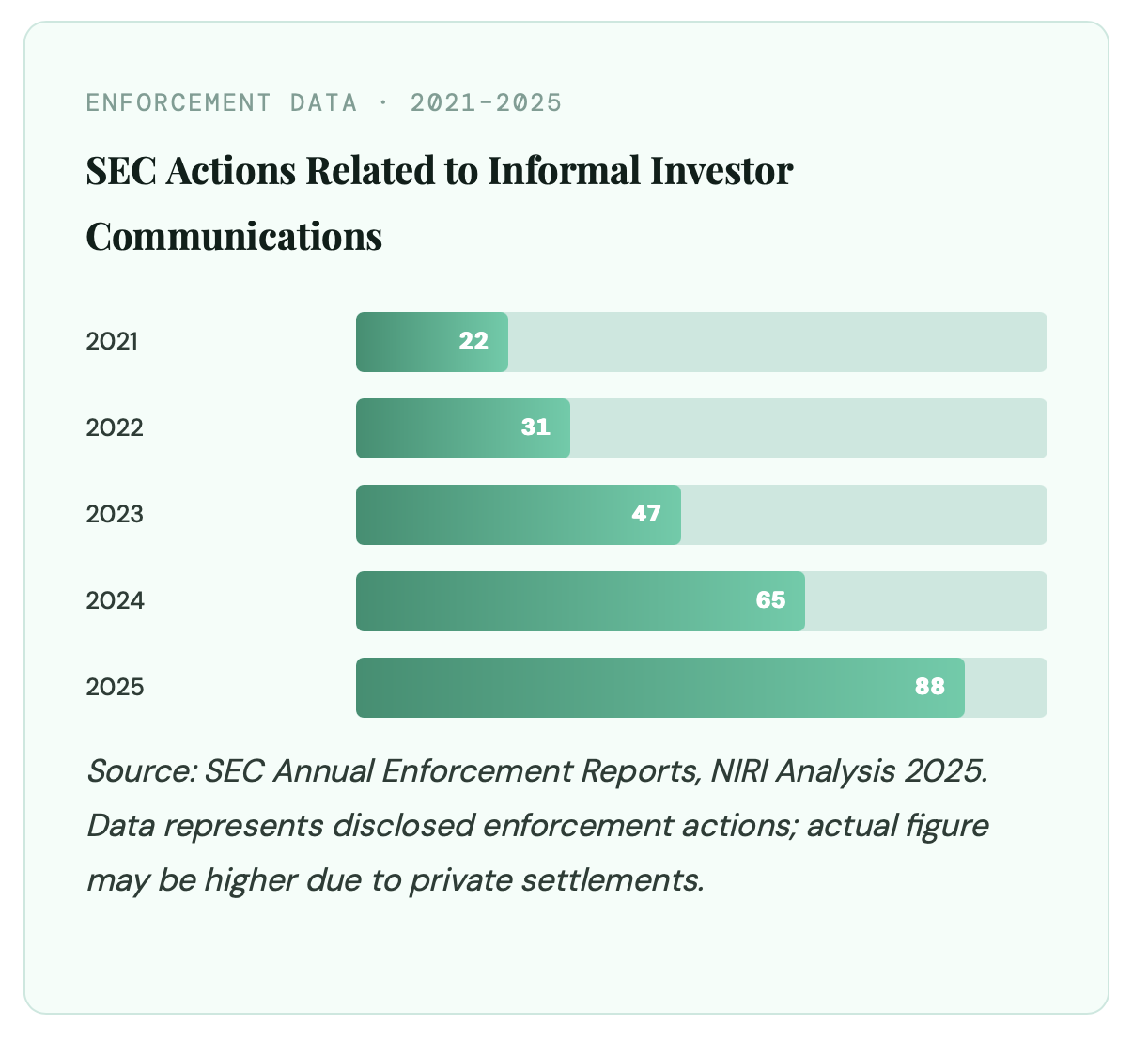 Enforcement surge: 88 formal actions tied to informal communications. Podcast appearances, Discord communities, and newsletter comments become primary investigation triggers.
