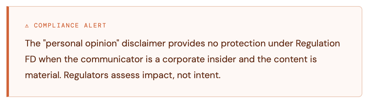 Substacks and investor newsletters present similar challenges. A founder with a popular newsletter who discusses their company's product roadmap in ways that imply business trajectory may be providing forward guidance without any of the legal safe harbors that would protect a formal earnings call statement.
