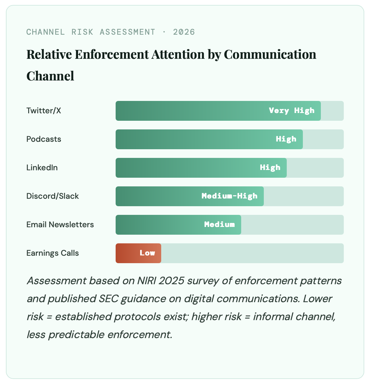 The full text of Regulation FD was written for the press release era, but it is being enforced in the TikTok era. A 2024 survey by the National Investor Relations Institute (NIRI) found that 62% of IR professionals reported increased compliance complexity due to social media and podcast channels (NIRI, 2024). The proliferation of investor-adjacent media has created a compliance challenge that many IR teams have not fully mapped.