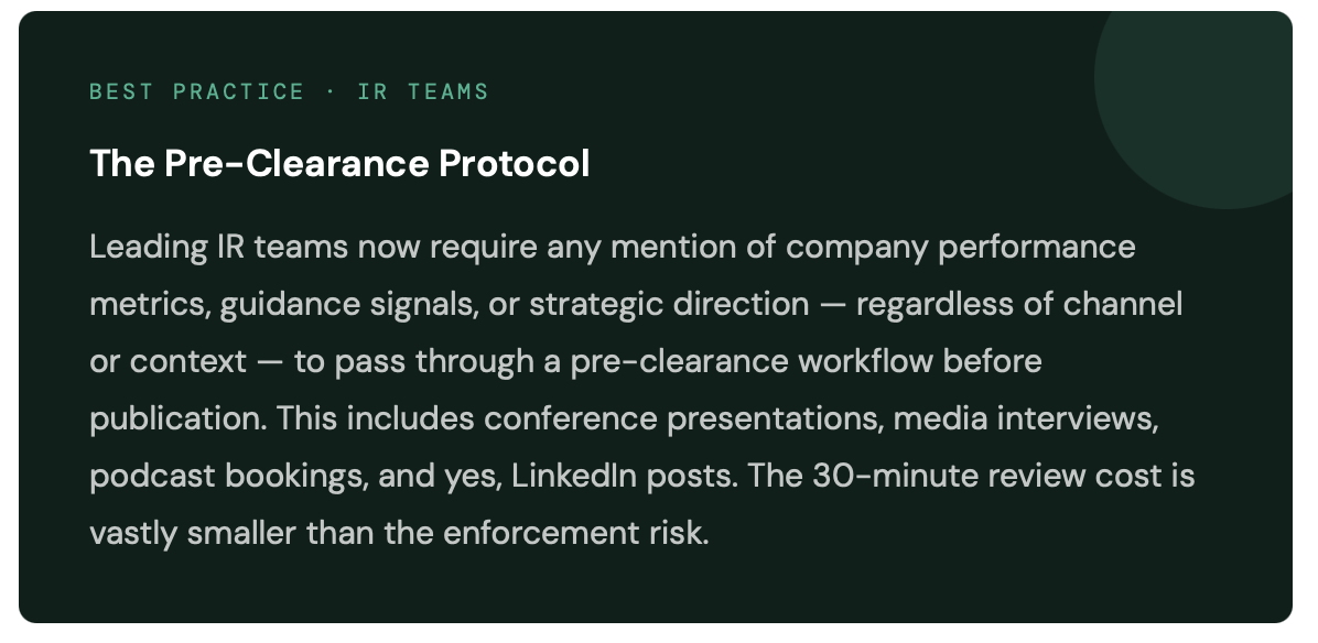 Before any officer-level social or media communication, IR teams should verify five conditions: whether the information is already publicly disclosed, whether a reasonable investor would consider it material, whether it is being shared through a designated disclosure channel simultaneously, whether the communicator has regular access to material non-public information, and whether legal or IR has reviewed the content.