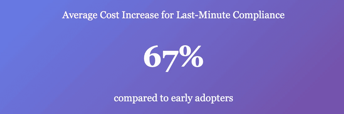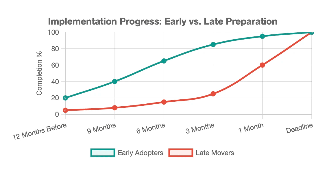 The data tells a concerning story. Firms that wait until the last minute consistently face higher implementation costs, more operational disruptions, and increased risk of non-compliance. Meanwhile, early adopters are already reaping the benefits of improved systems and processes.