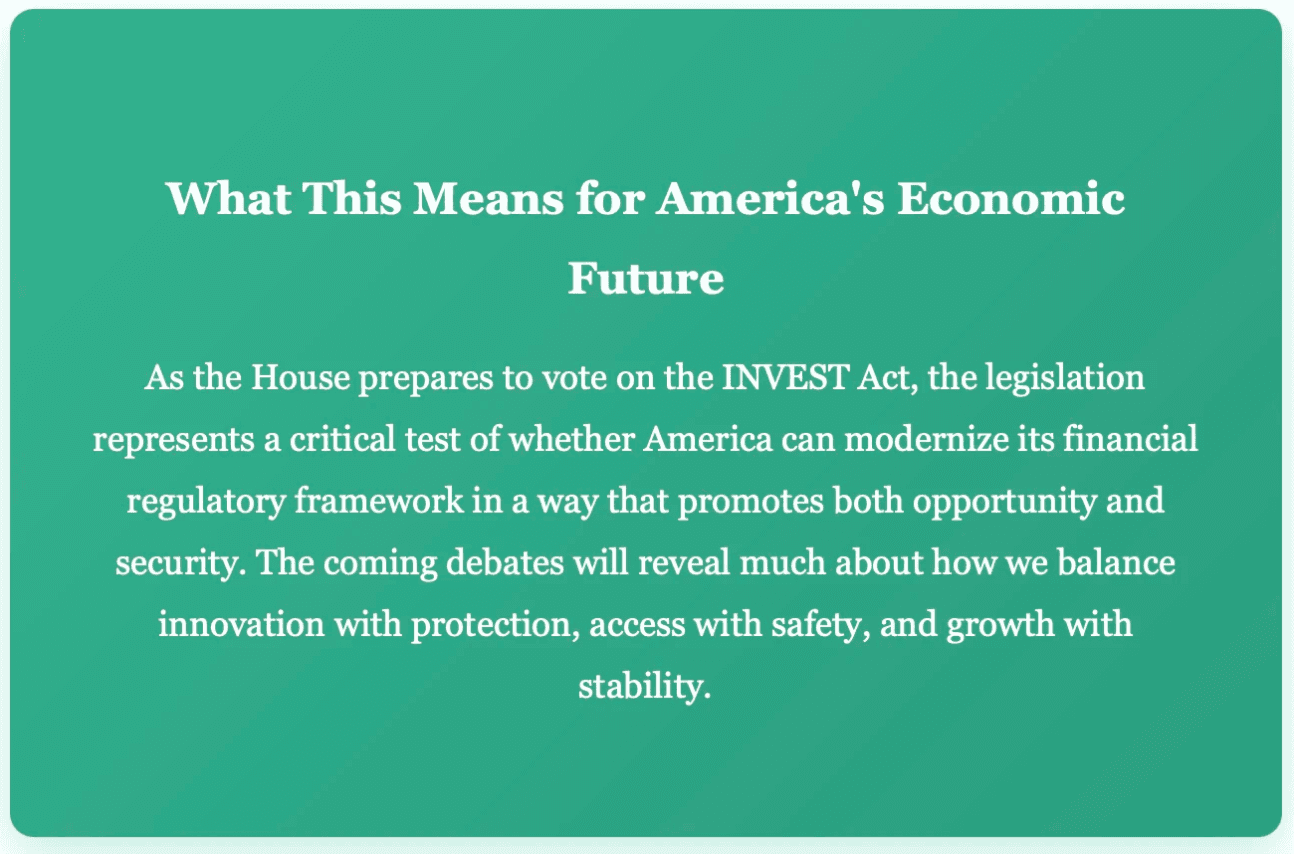 These questions cannot be answered in advance. What we can say is that after decades of incremental regulatory additions, the INVEST Act represents a serious attempt to step back, reassess, and modernize—to ask not just what regulations we have, but what regulations we actually need.