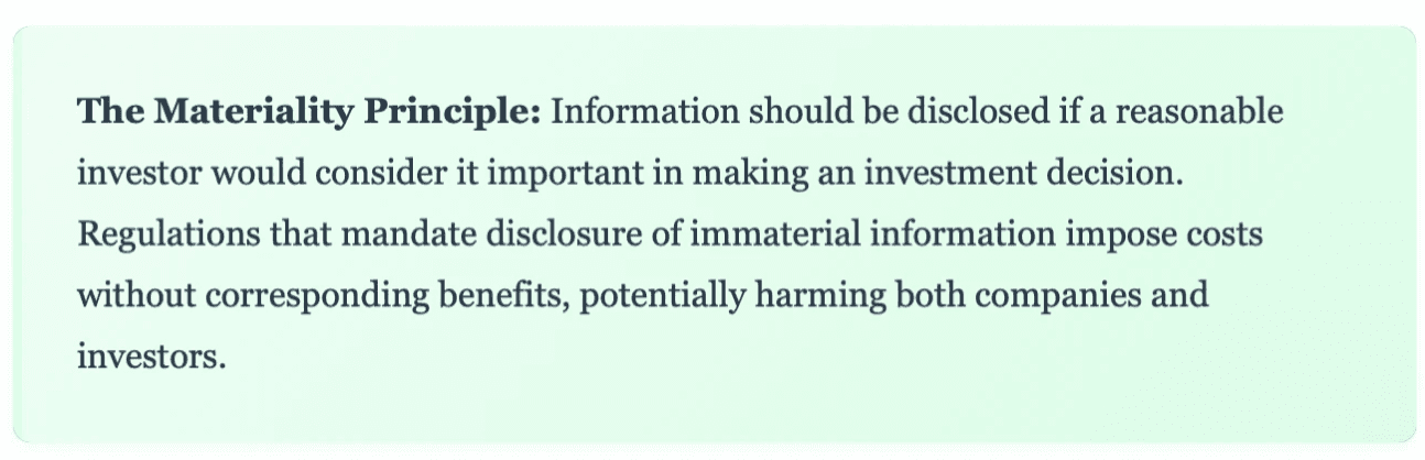 Materiality insists that disclosure requirements should focus on information that genuinely affects investment decisions. SEC Chairman Paul Atkins recently articulated this concern, noting that disclosure regimes requiring information "unmoored from materiality" do not actually benefit investors. Instead, they create compliance costs that divert resources from productive activities while overwhelming investors with irrelevant data.