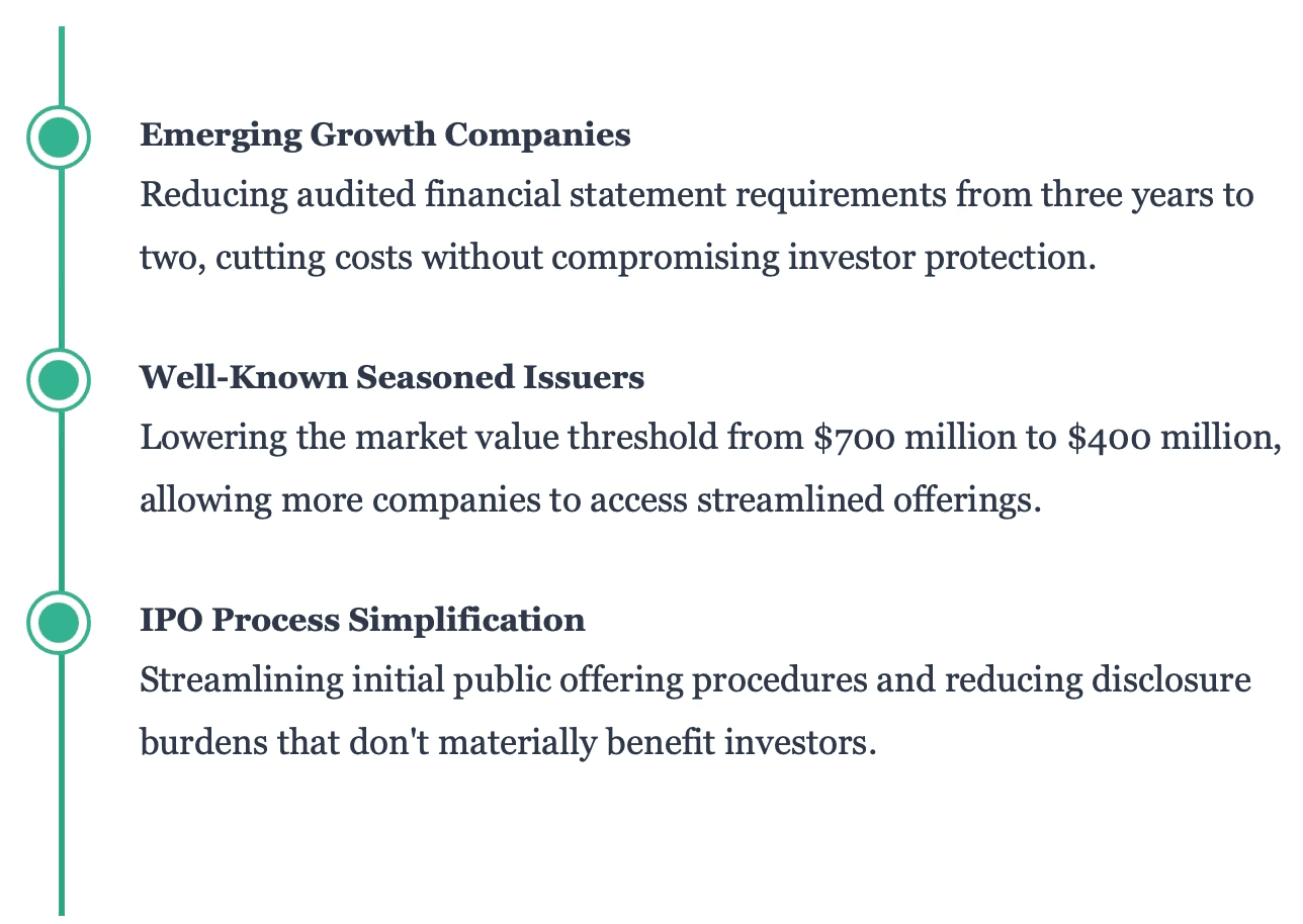 The third pillar tackles the decline in public company listings by reducing compliance burdens that disproportionately affect smaller firms. These reforms recognize that excessive disclosure requirements can actually harm investors by discouraging companies from going public, thereby reducing investment options.