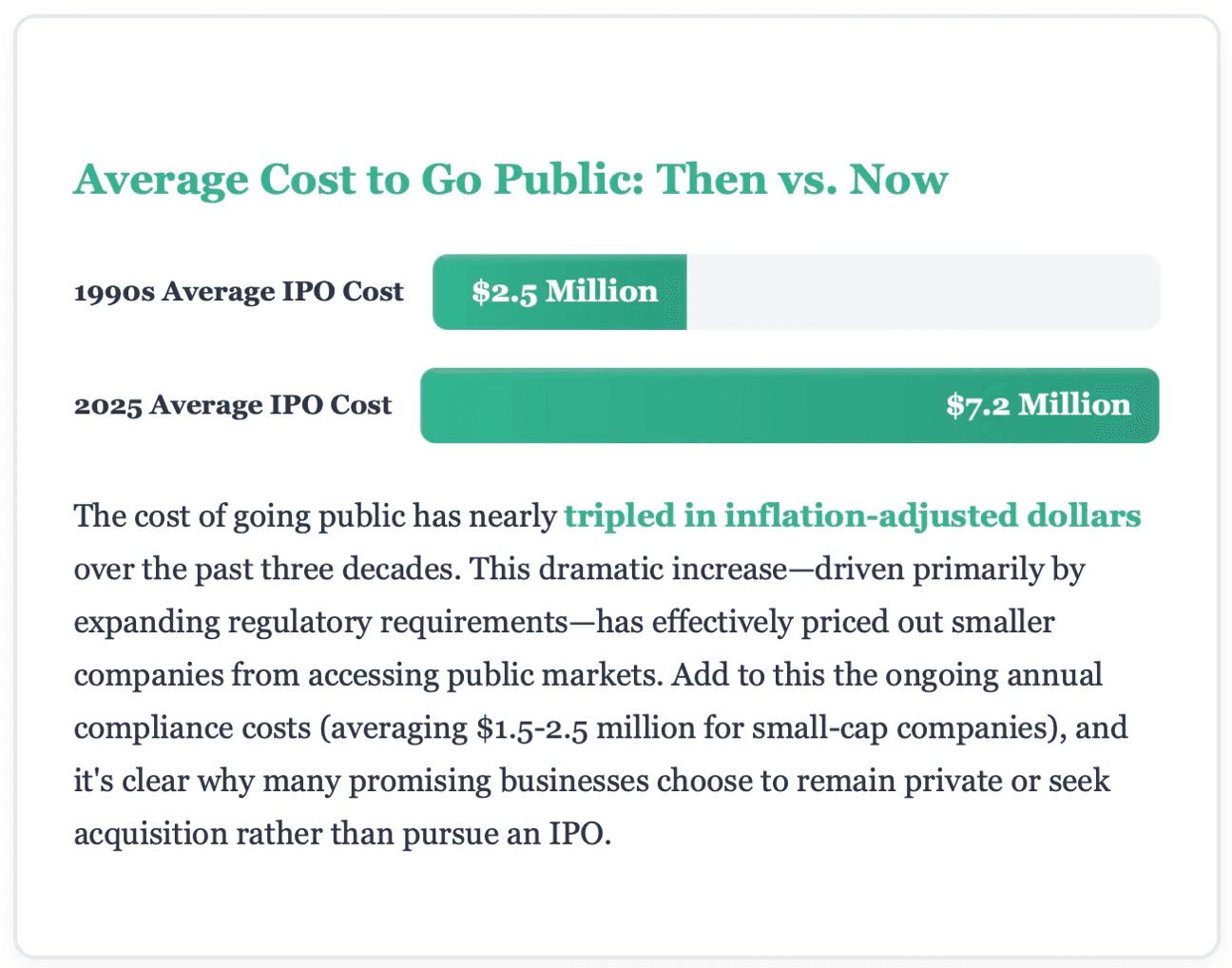 The numbers tell a sobering story. Since 1997, the number of publicly traded companies in the United States has plummeted from 8,800 to fewer than 4,000 today. This dramatic decline reflects not just changing business preferences, but a regulatory environment that has made going public increasingly burdensome and expensive.