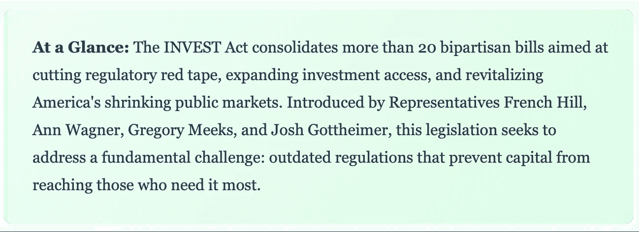 In the corridors of Capitol Hill, a bipartisan revolution is quietly taking shape. The Incentivizing New Ventures and Economic Strength Through Capital Formation Act—better known as the INVEST Act—represents one of the most ambitious attempts in recent years to reimagine how America's capital markets serve entrepreneurs, small businesses, and everyday investors.