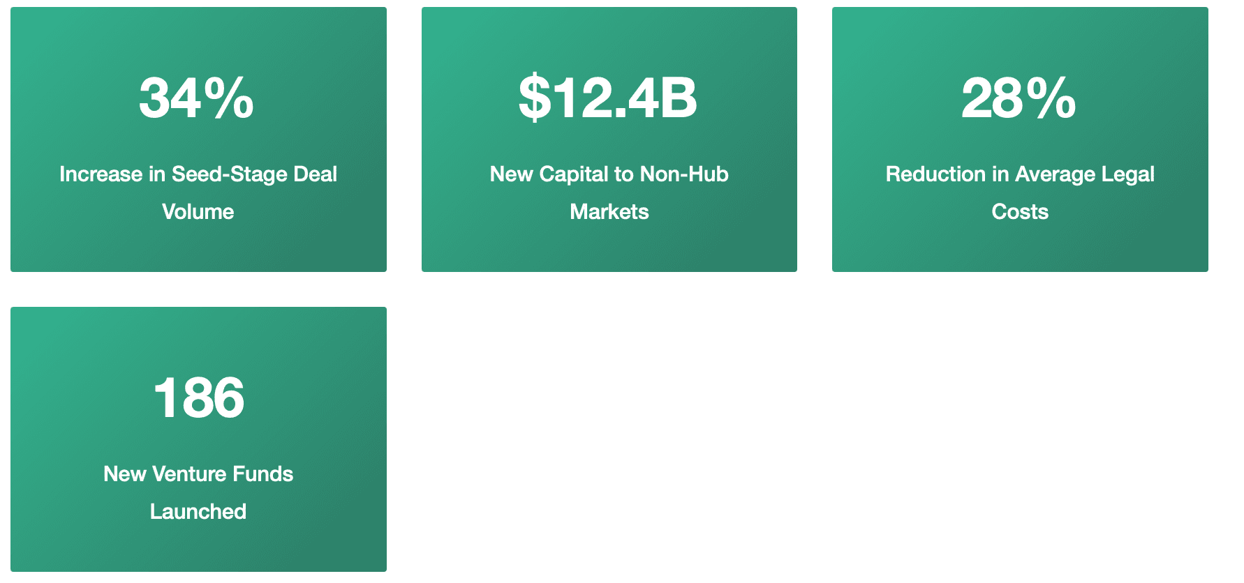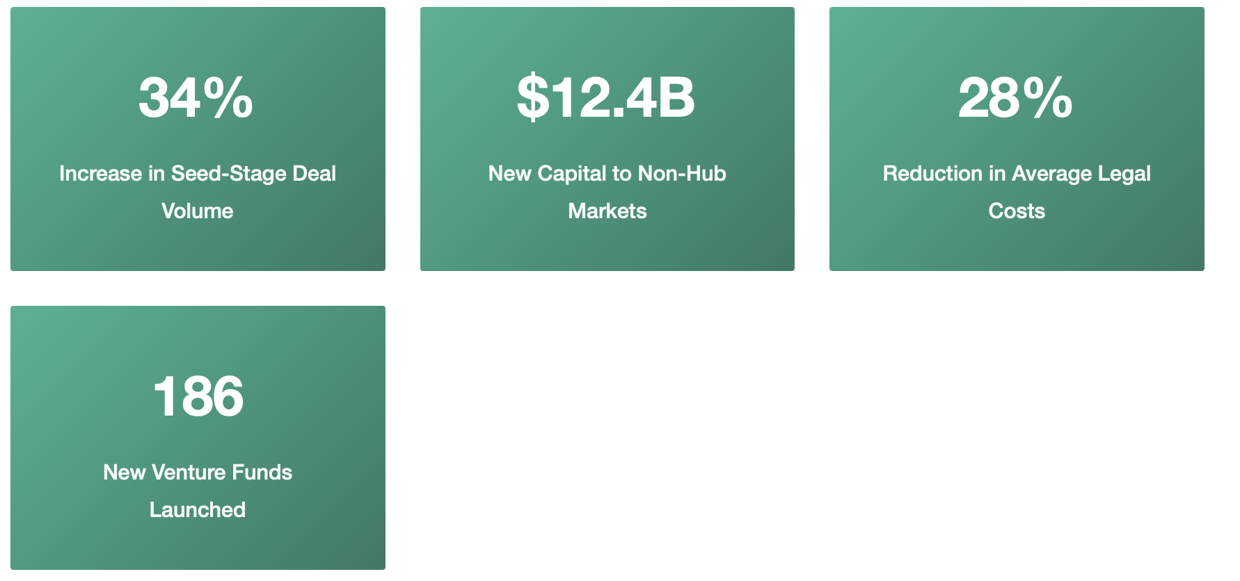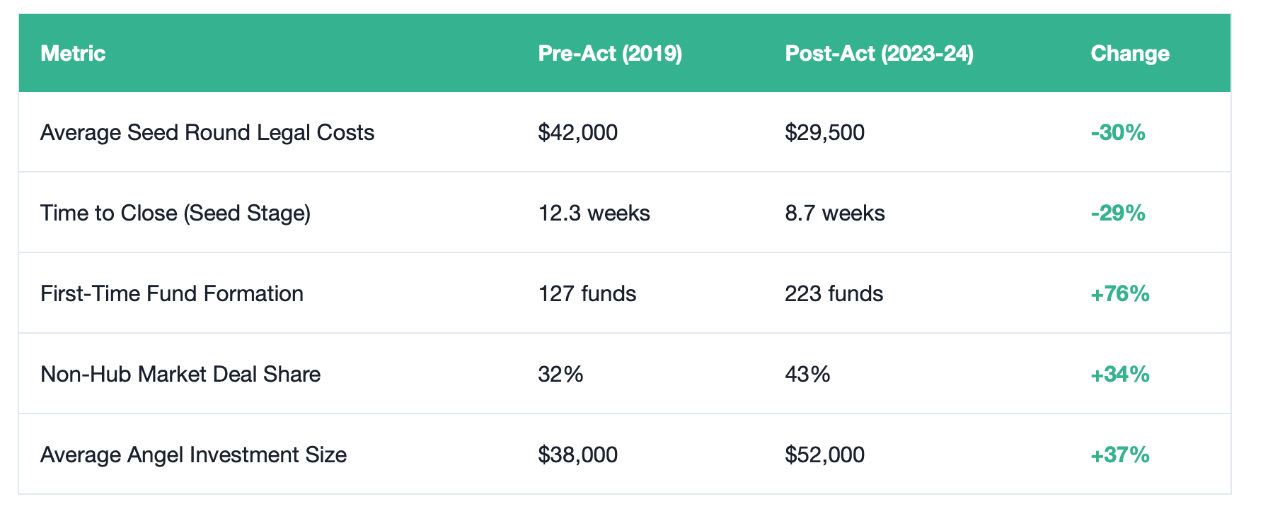 One of the Act's most notable impacts has been accelerated geographic diversification of venture capital deployment. Secondary and tertiary markets have experienced disproportionate growth in both deal volume and capital committed, suggesting reduced friction in capital flows to non-traditional markets.