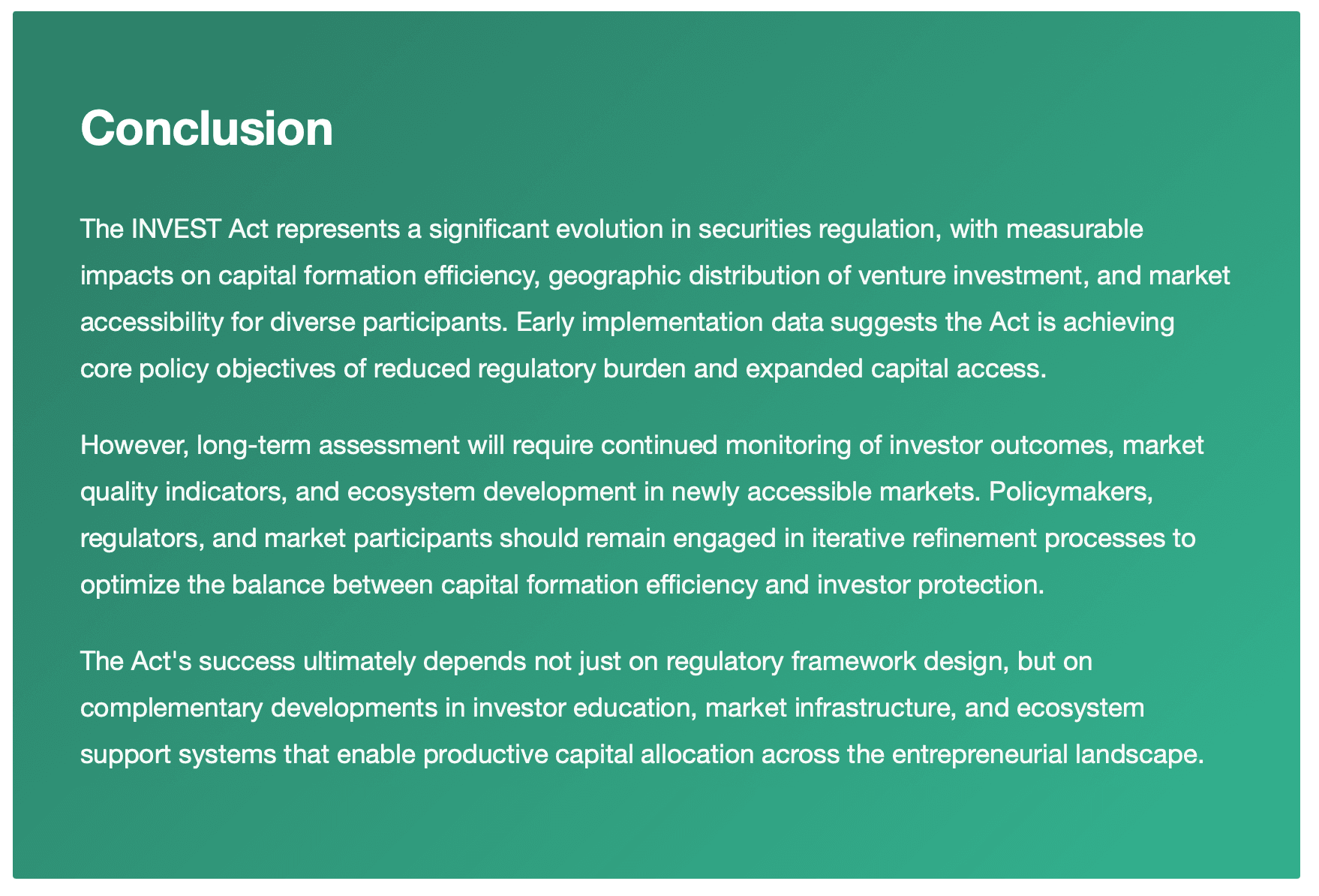 The Act's ultimate impact will emerge over multiple investment cycles as capital flows adjust to new regulatory equilibria and ecosystem development in secondary markets matures.