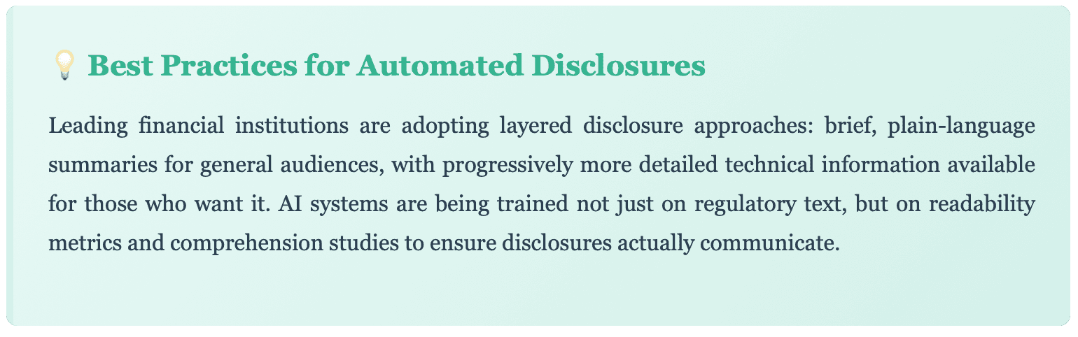The challenge is ensuring these disclosures don't simply check compliance boxes but actually inform consumers meaningfully. An AI that generates technically accurate but incomprehensible disclosures serves neither the institution's nor the consumer's interests.