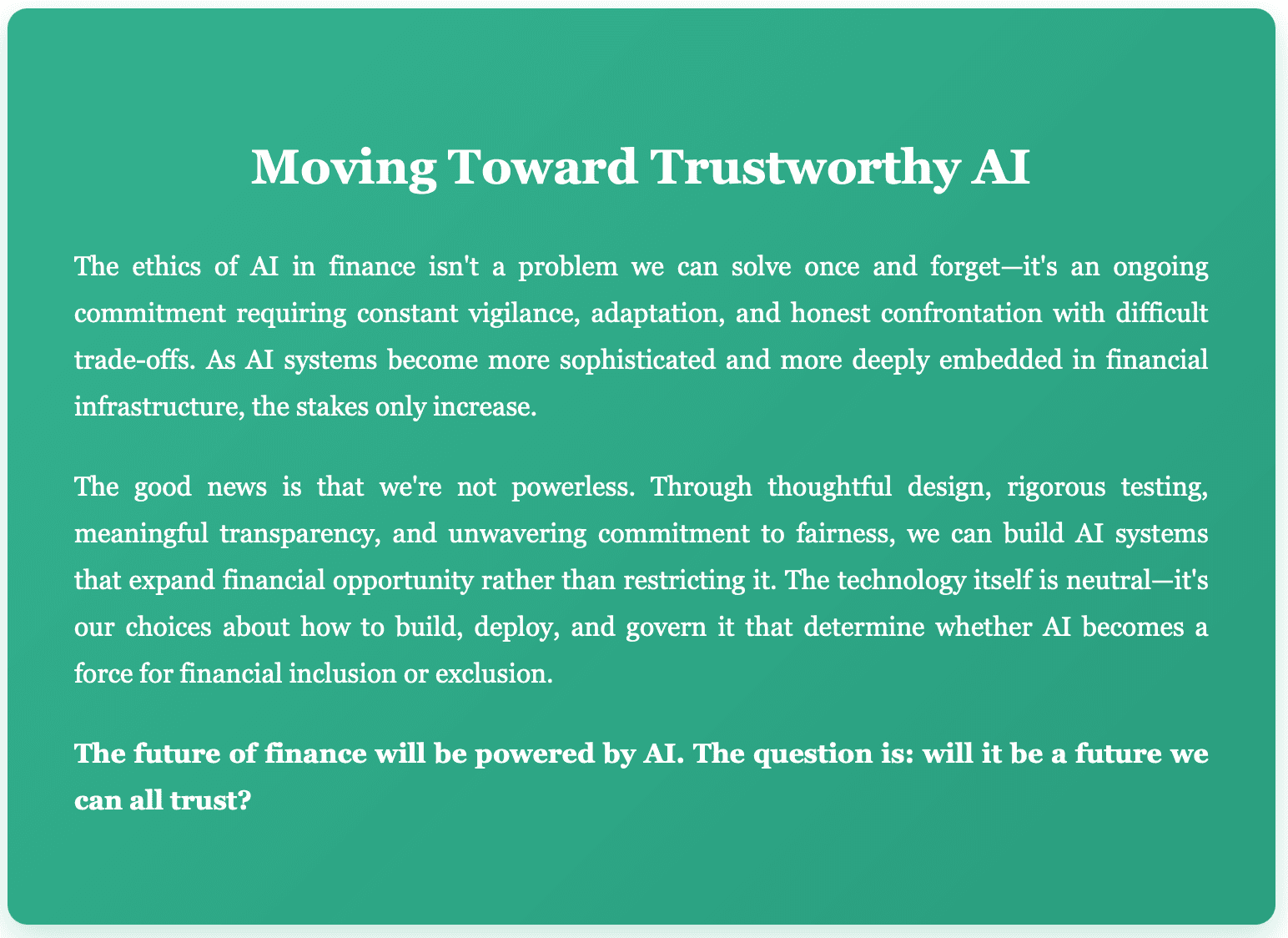 **Financial Institutions **must invest in ethical AI infrastructure, conduct regular bias audits, and foster cultures that prioritize fairness alongside profitability. This means sometimes accepting slightly lower short-term performance for better long-term outcomes and reduced risk.