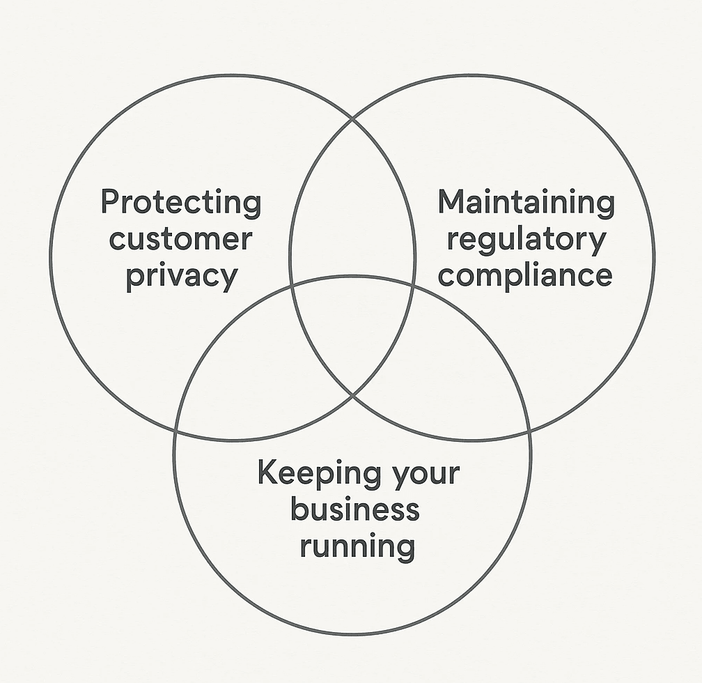 Picture a Venn diagram where three circles overlap: protecting customer privacy, maintaining regulatory compliance, and keeping your business running. That tiny space in the middle? That's where financial institutions are desperately trying to operate, armed with nothing but spreadsheets, hope, and an unhealthy amount of caffeine.
