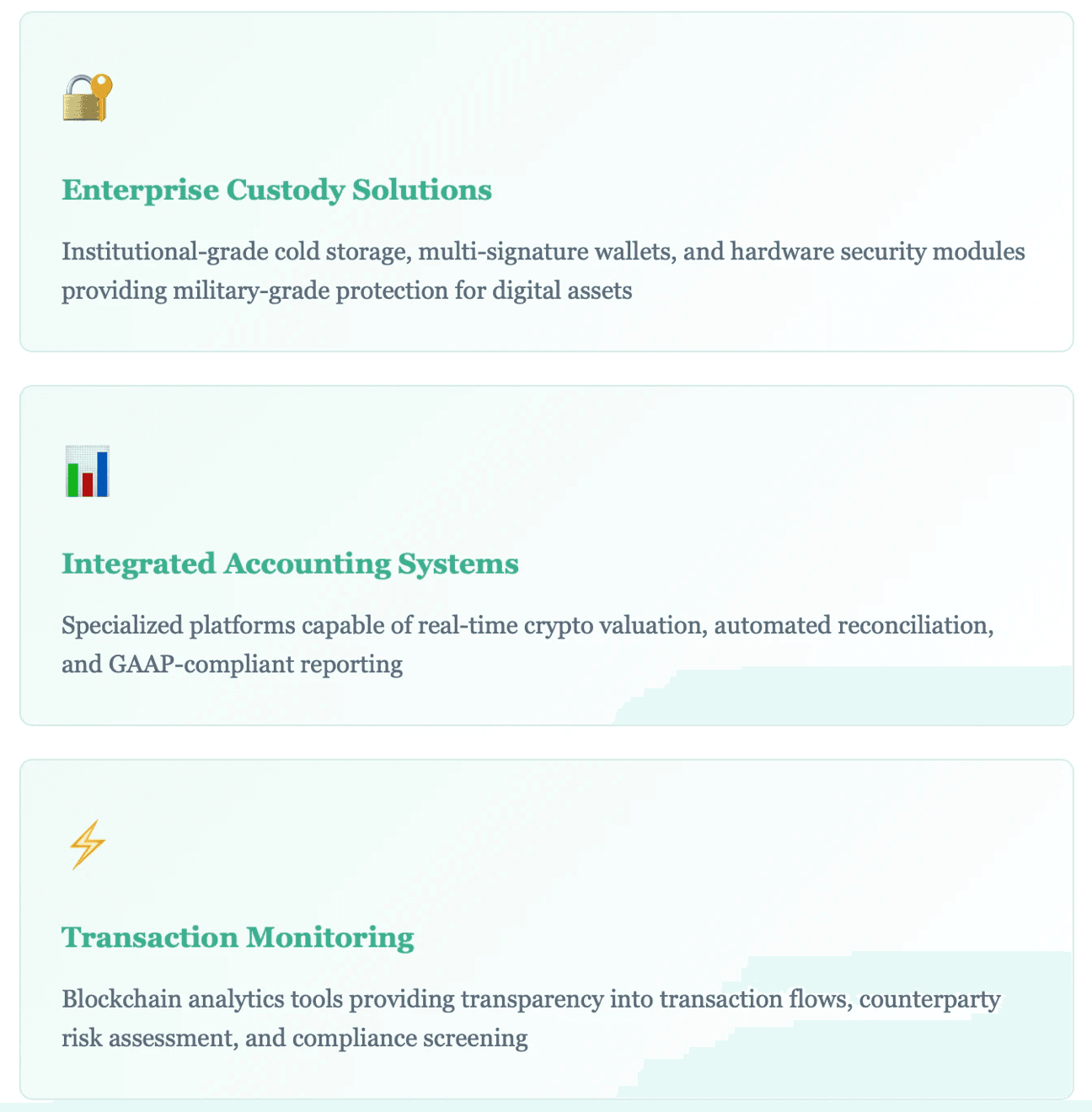 Traditional financial systems were architected for centralized, permission-based networks with clear intermediaries and standardized settlement periods. Cryptocurrency operates on fundamentally different principles—decentralized validation, cryptographic security, and near-instantaneous settlement. This paradigm shift necessitates a comprehensive technology overhaul that extends across custody solutions, accounting systems, and transaction monitoring capabilities.