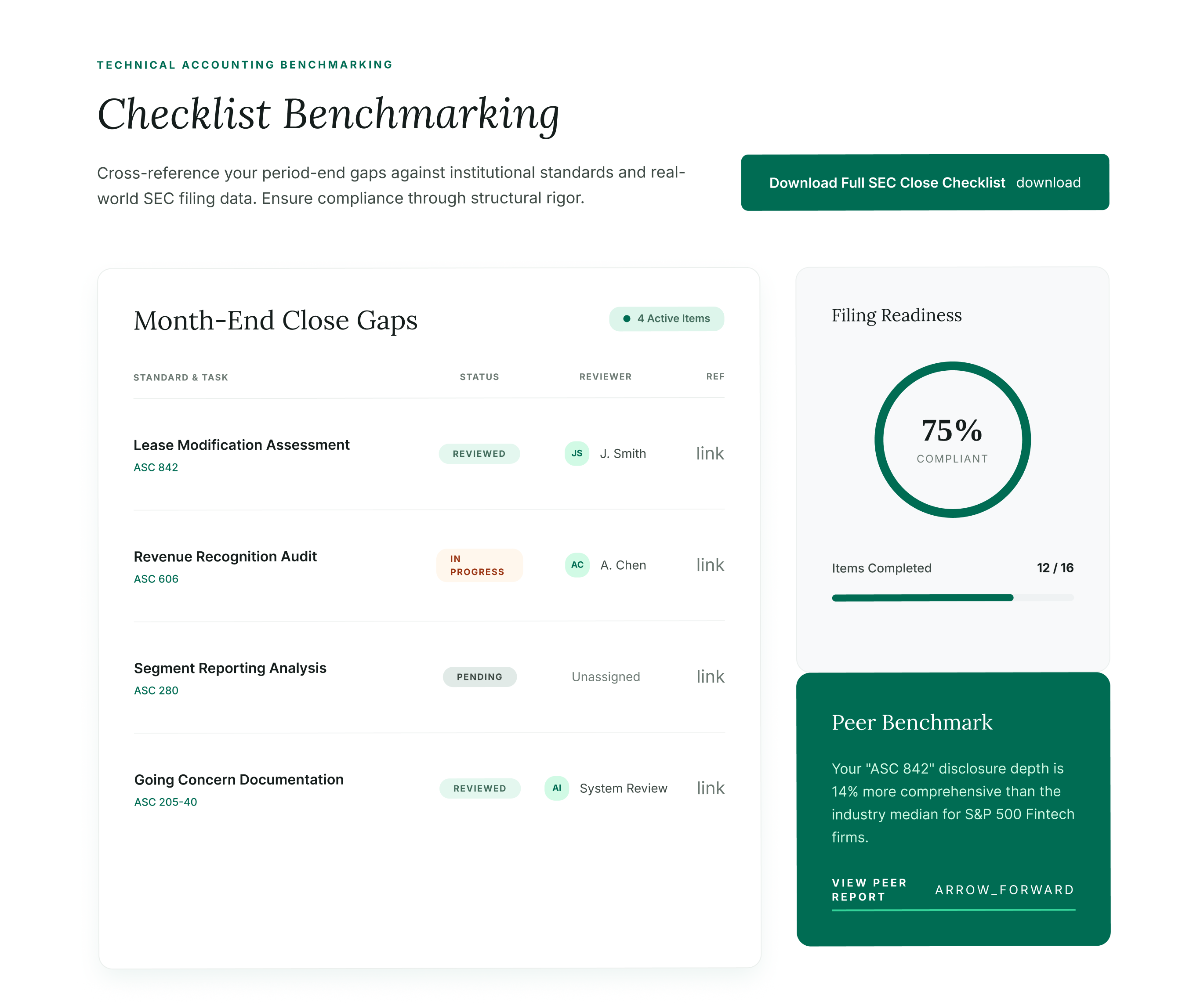 - Finrep's Checklist Benchmarking feature and ASC guidance module automate the research layer of this process, reducing close cycle time and audit review loops.