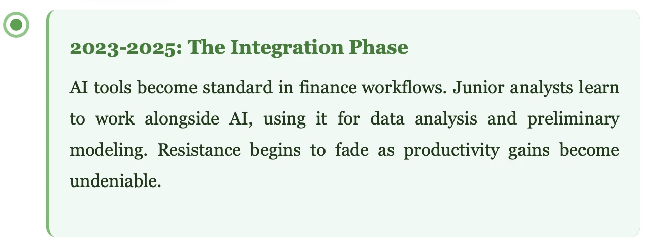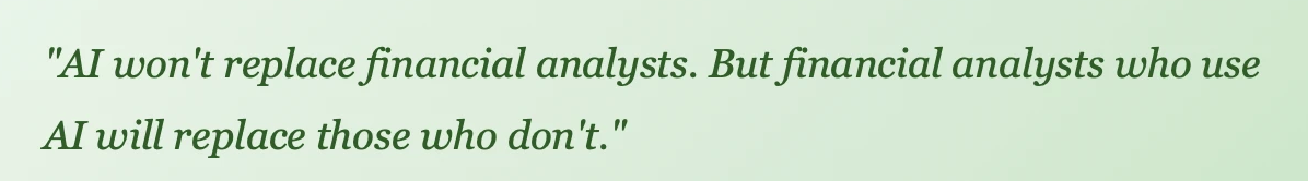 Let's be honest about what AI is already doing better than most analysts. The traditional grunt work that once defined entry-level finance roles is rapidly being absorbed by artificial intelligence. Financial modeling that took hours now takes minutes. Market research that required days of reading can be synthesized in seconds. Even complex valuation models can be generated with the right prompts.
