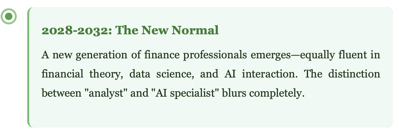 Finance isn't dying—it's transforming. Yes, AI will eliminate certain tasks and reshape job descriptions. But the fundamental need for financial expertise, strategic thinking, and human judgment isn't disappearing. What's changing is the nature of competitive advantage.